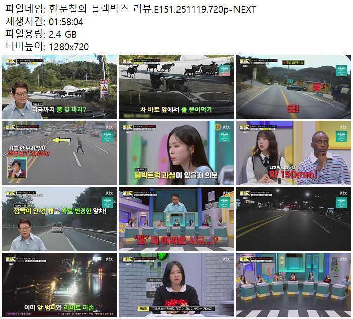 | 한문철의 블랙박스 리뷰.E151.251119.720p-NEXT.mp4 | 2.4 G | 01:58:00 | 1280x720 |