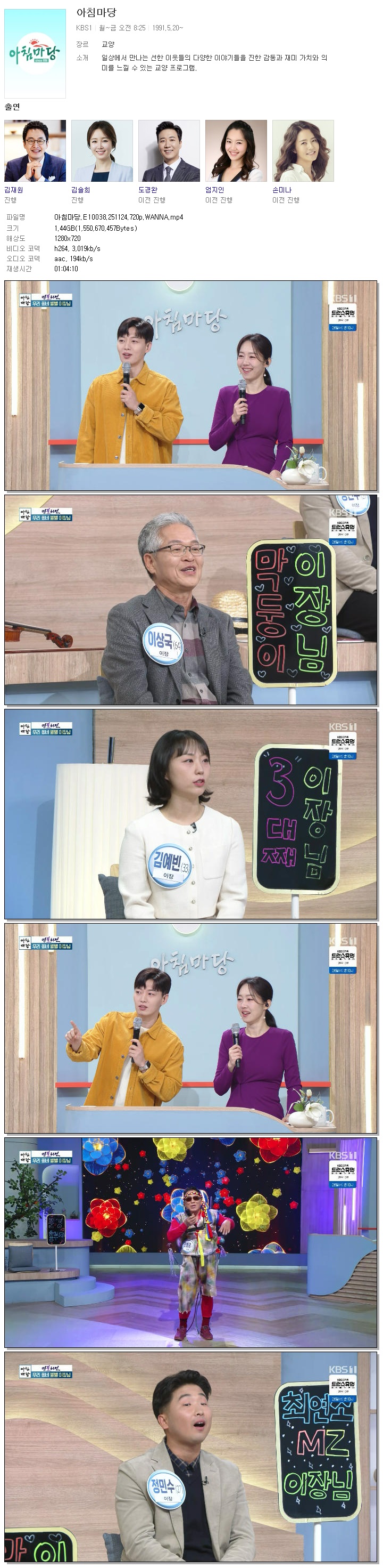 | [KBS1] 아침마당.E10038.251124.720p.WANNA[엄지인, 박철규].mp4 | 1.4 G | 01:04:10 | 1280x720 |