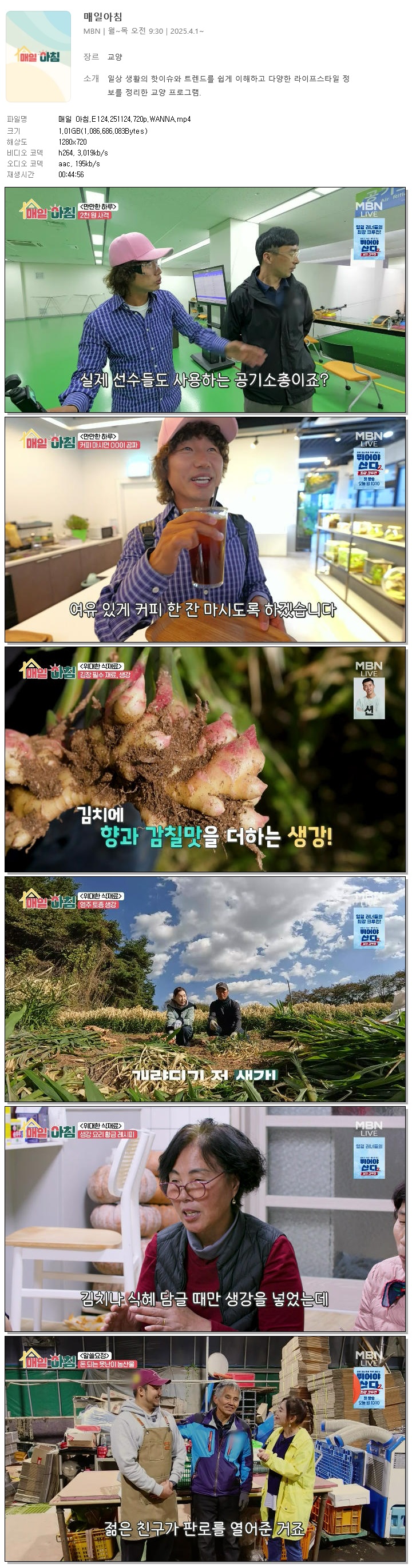 | [MBN] 매일 아침.E124.251124.720p.WANNA[한혜원, 이정수].mp4 | 1 G | 00:44:56 | 1280x720 |