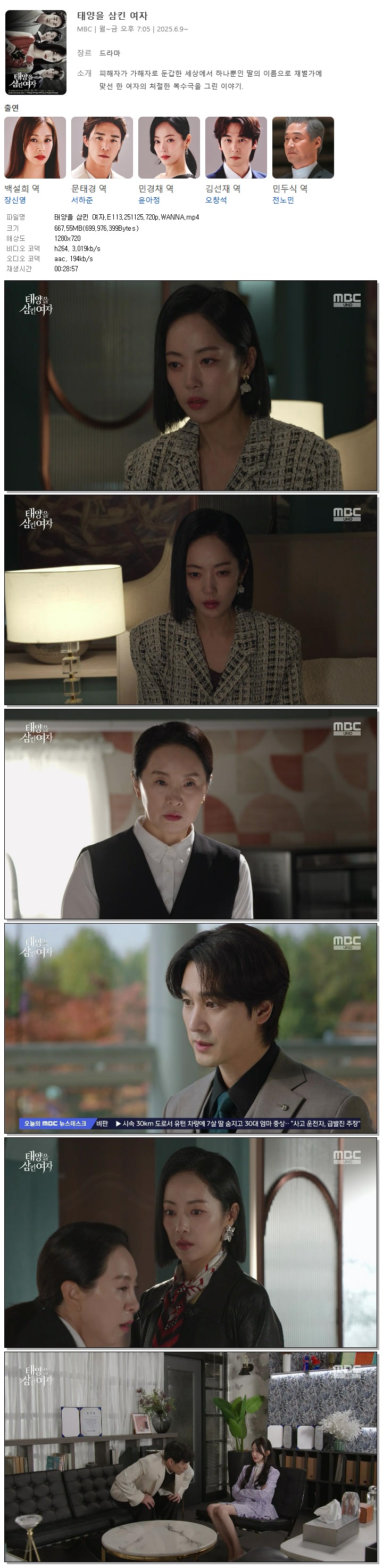 [MBC] 태양을 삼킨 여자.E113.251125.720p.WANNA[장신영, 서하준].mp4 667.5 M 00:28:57 1280x720