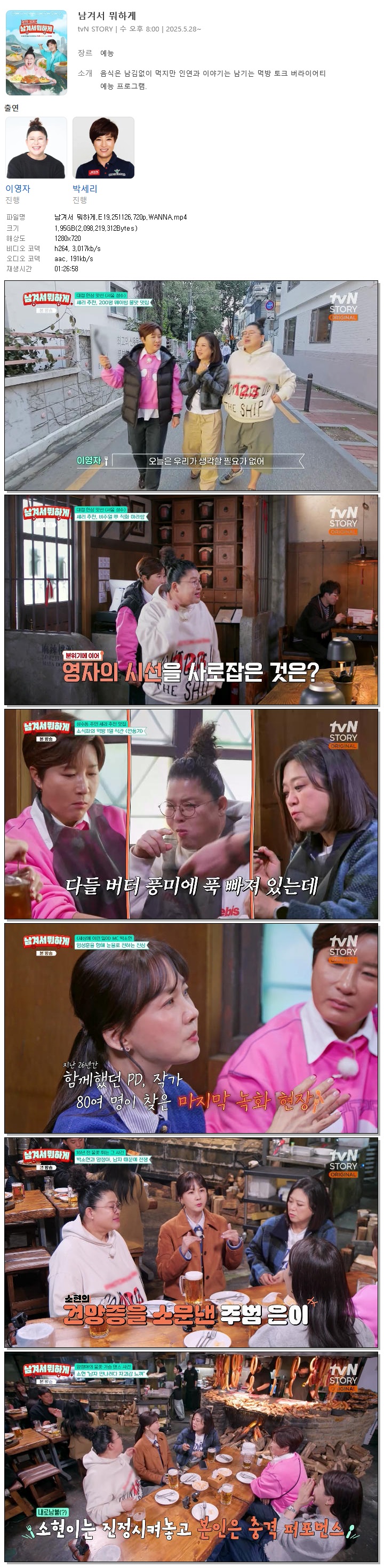 [TVN STORY] 남겨서 뭐하게.E19.251126.720p.WANNA[박소현, 김숙].mp4 2 G 01:26:58 1280x720