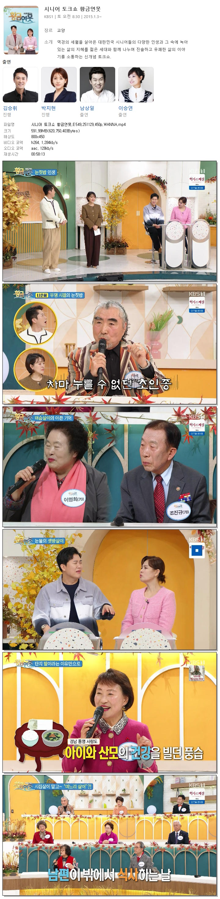 | [KBS1] 시니어 토크쇼 황금연못.E549.251129.450p.WANNA[김승휘, 박지현].mp4 | 592 M | 00:58:13 | 800x450 |