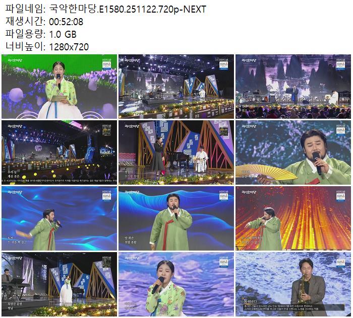 | 국악한마당.E1580.251122.720p-NEXT.mp4 | 1 G | 00:52:08 | 1280x720 |