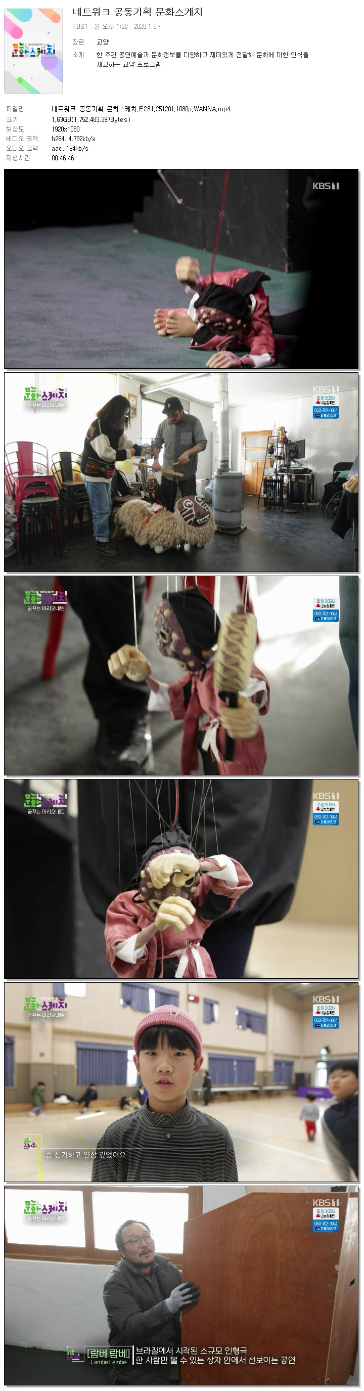 | [KBS1] 네트워크 공동기획 문화스케치.E281.251201.1080p.WANNA.mp4 | 1.6 G | 00:46:46 | 1920x1080 |