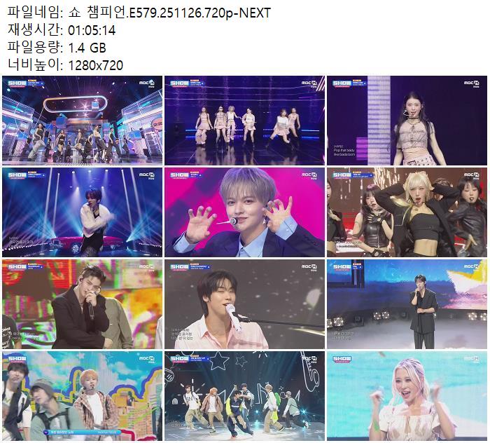 | 쇼 챔피언.E579.251126.720p-NEXT.mp4 | 1.4 G | 01:05:00 | 1280x720 |