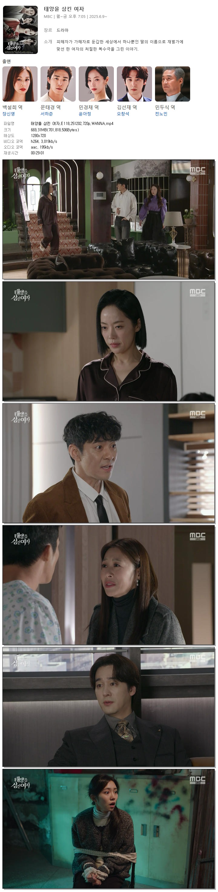 [MBC] 태양을 삼킨 여자.E118.251202.720p.WANNA[장신영, 서하준].mp4 669.3 M 00:29:01 1280x720