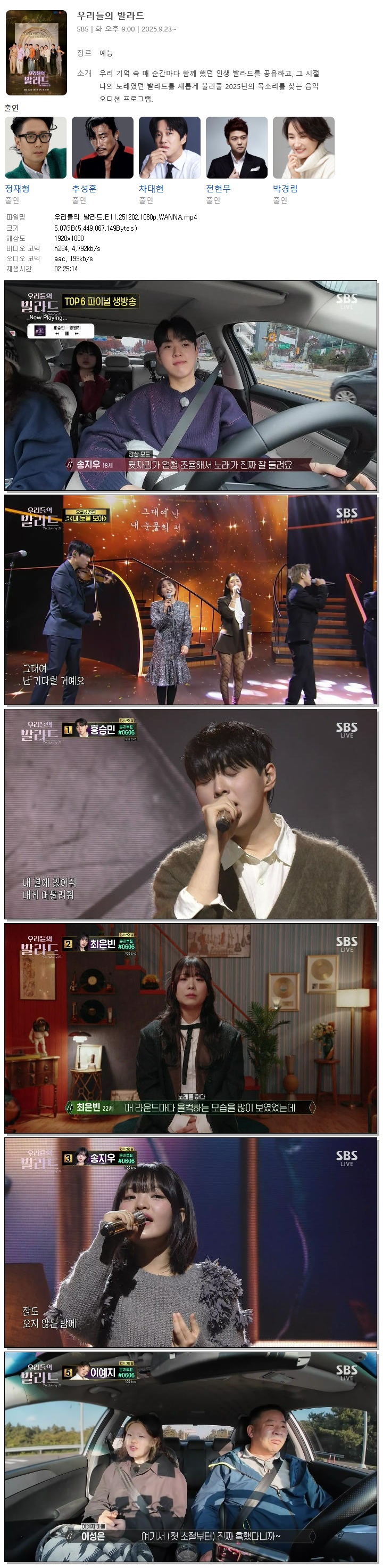 [SBS] 우리들의 발라드.E11.251202.1080p.WANNA[정재형, 추성훈].mp4 5.1 G 02:25:14 1920x1080