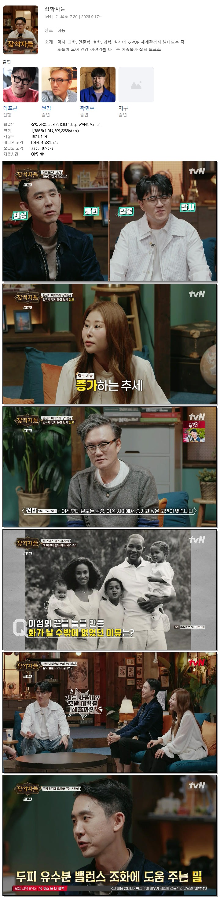 | [TVN] 잡학자들.E09.251203.1080p.WANNA[데프콘, 썬킴].mp4 | 1.8 G | 00:51:04 | 1920x1080 |