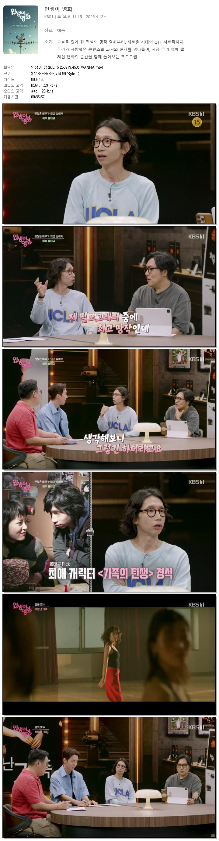 | [KBS1] 인생이 영화.E15.250719.450p.WANNA.mp4 | 377.4 M | 00:36:57 | 800x450 |