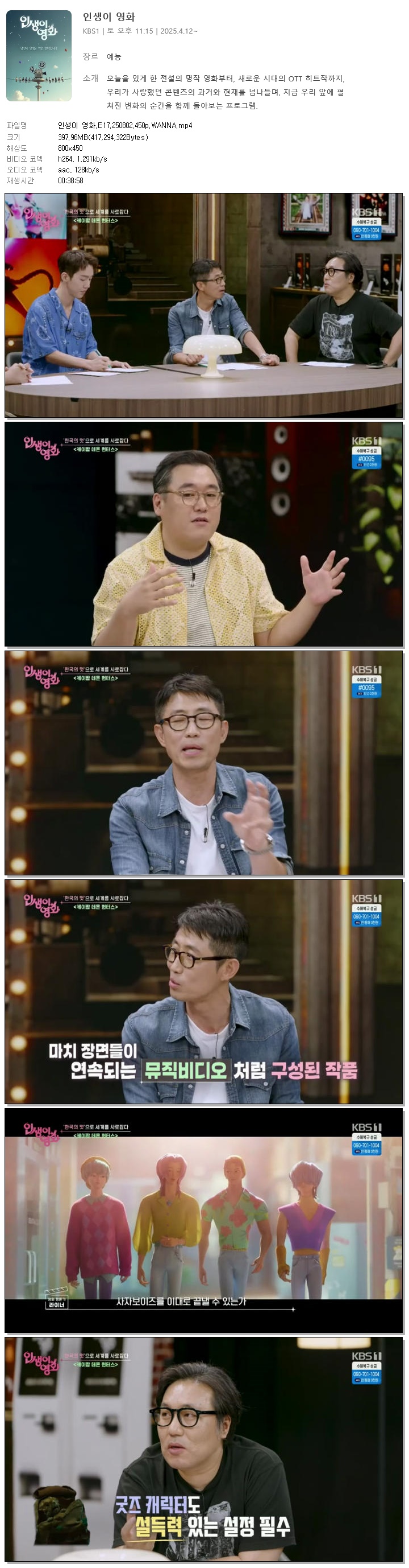 | [KBS1] 인생이 영화.E17.250802.450p.WANNA.mp4 | 398 M | 00:38:58 | 800x450 |