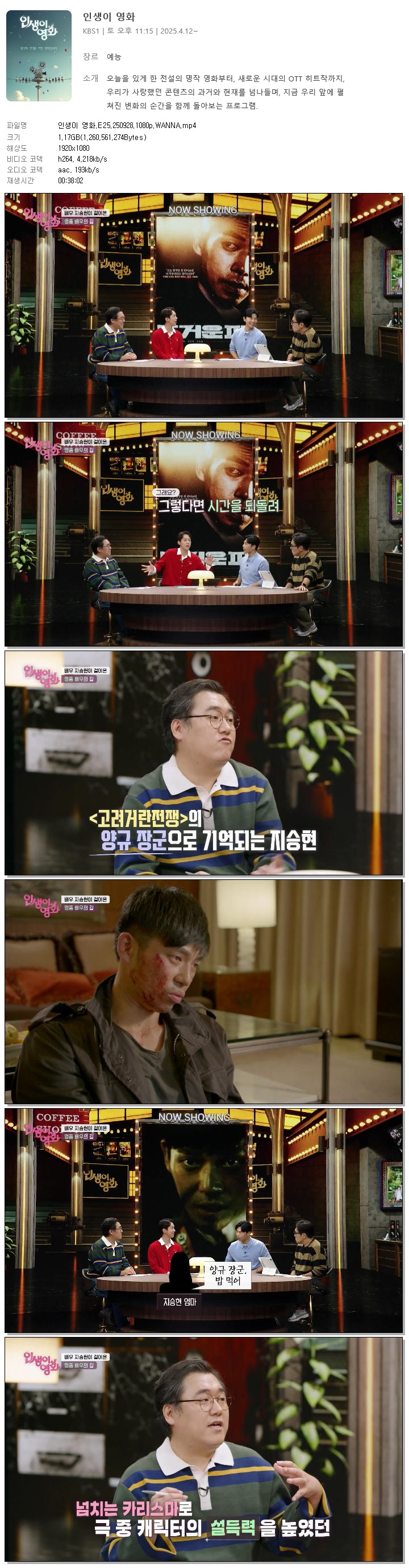 | [KBS1] 인생이 영화.E25.250928.1080p.WANNA.mp4 | 1.2 G | 00:38:02 | 1920x1080 |