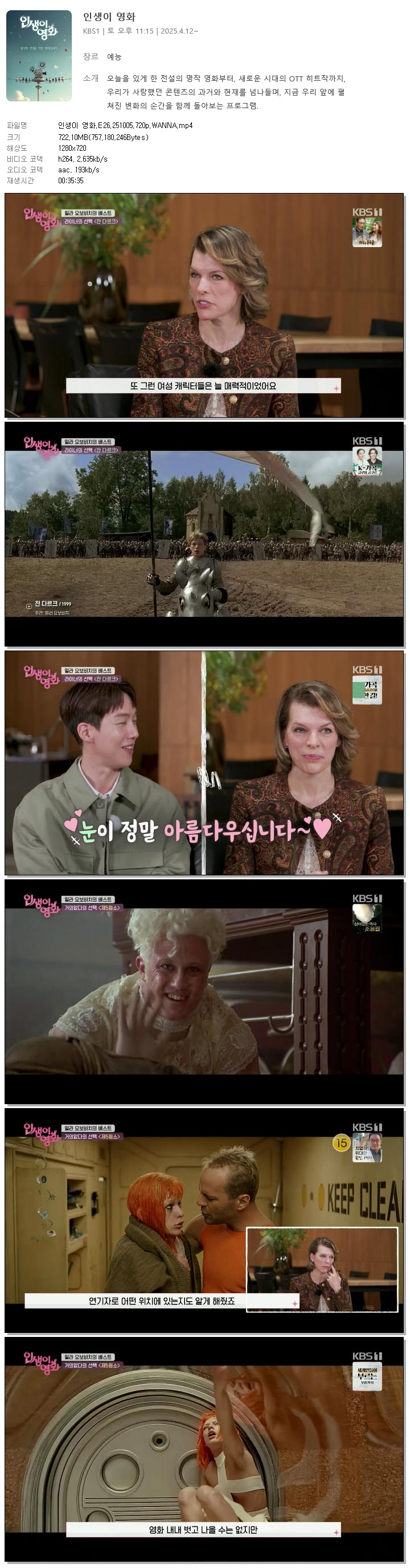 | [KBS1] 인생이 영화.E26.251005.720p.WANNA.mp4 | 722.1 M | 00:35:35 | 1280x720 |