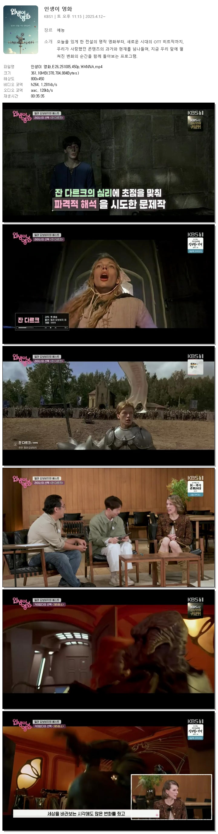 | [KBS1] 인생이 영화.E26.251005.450p.WANNA.mp4 | 361.2 M | 00:35:35 | 800x450 |