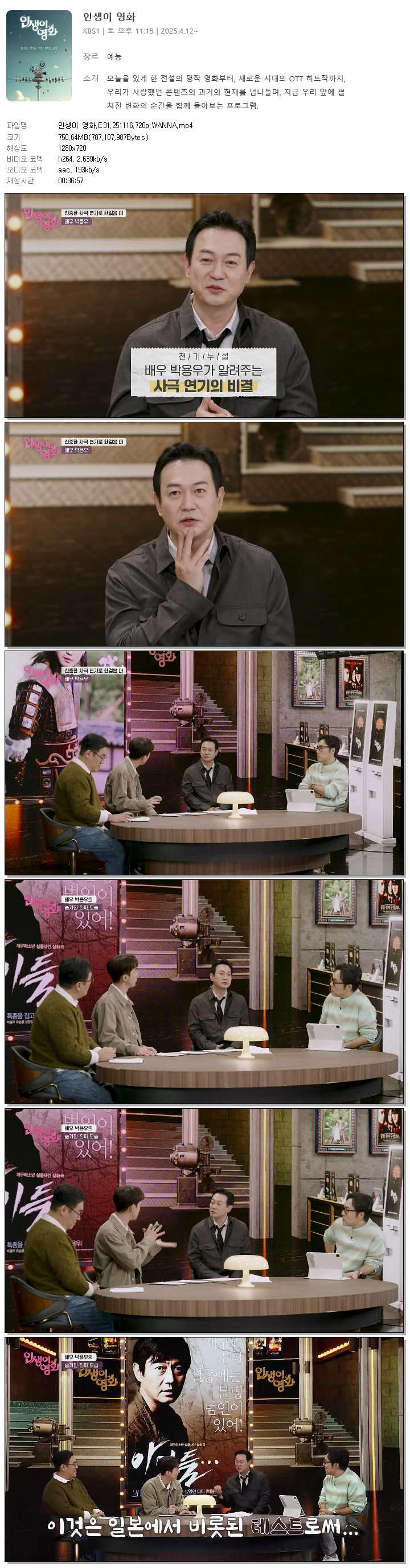 | [KBS1] 인생이 영화.E31.251116.720p.WANNA.mp4 | 750.6 M | 00:36:57 | 1280x720 |