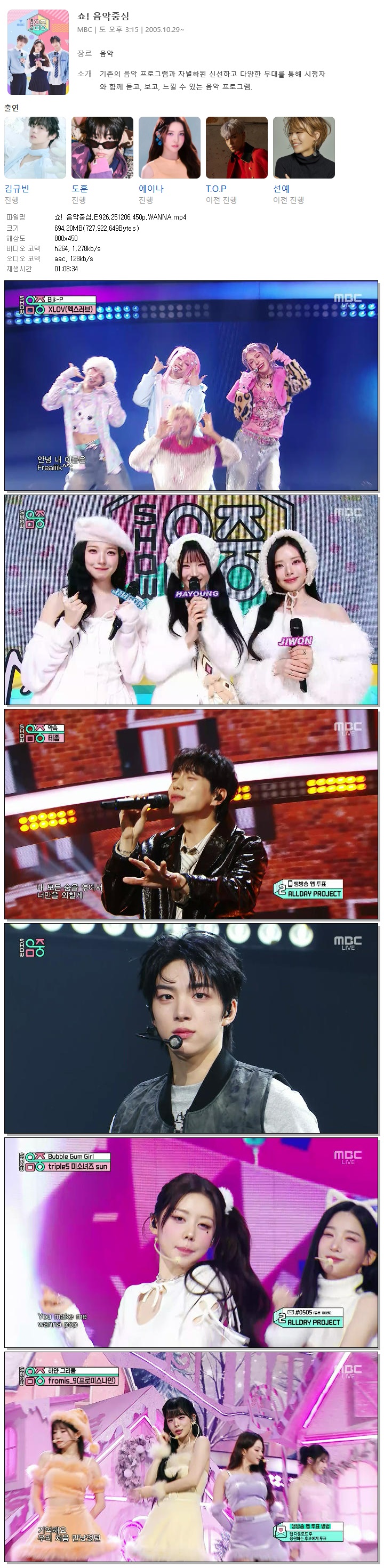 | [MBC] 쇼! 음악중심.E926.251206.450p.WANNA[프로미스나인, 아일릿].mp4 | 694.2 M | 01:08:34 | 800x450 |