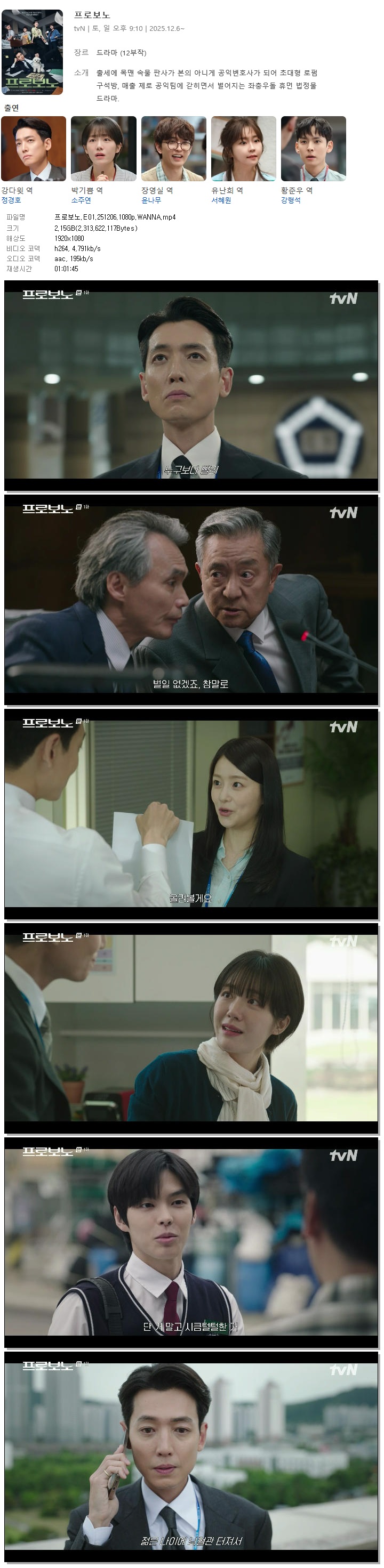 | [TVN] 프로보노.E01.251206.1080p.WANNA[정경호, 소주연].mp4 | 2.2 G | 01:01:45 | 1920x1080 |