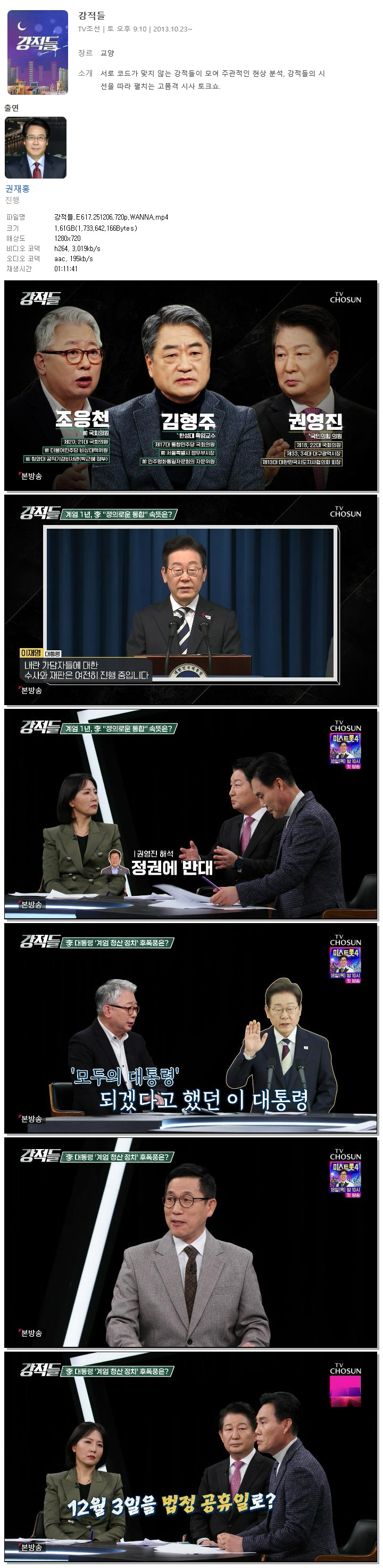 | [TV조선] 강적들.E617.251206.720p.WANNA[권재홍].mp4 | 1.6 G | 01:11:41 | 1280x720 |