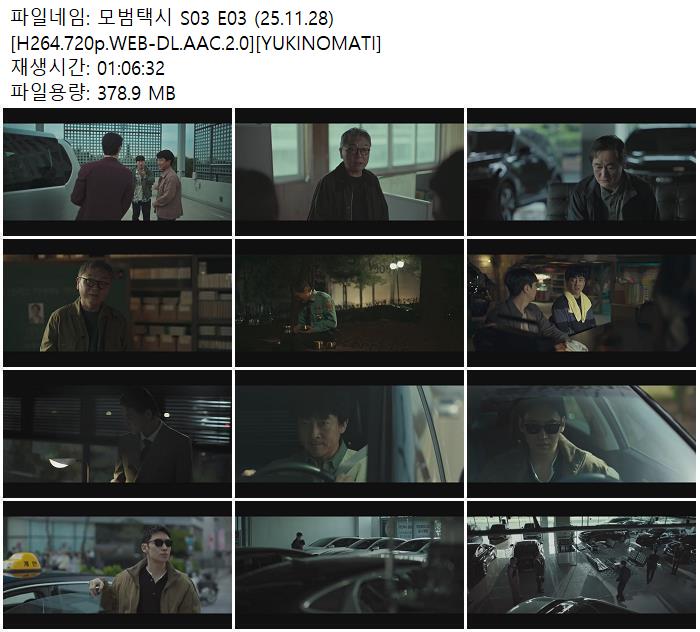 | 모범택시 S03 E03 (25.11.28) [H264.720p.WEB-DL.AAC.2.0][YUKINOMATI].mkv | 378.9 M | 01:06:00 | 1280x720 |