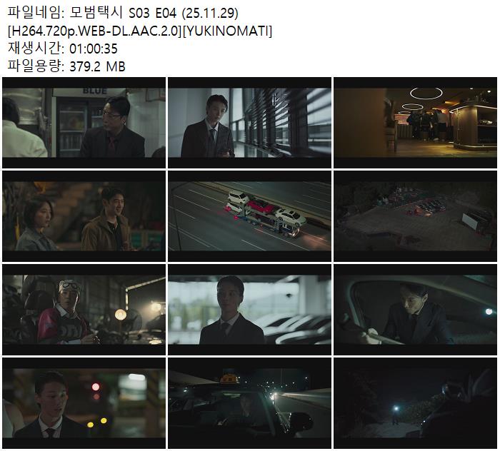 | 모범택시 S03 E04 (25.11.29) [H264.720p.WEB-DL.AAC.2.0][YUKINOMATI].mkv | 379.2 M | 01:00:00 | 1280x720 |