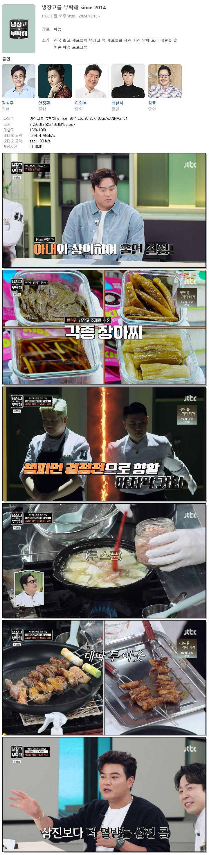 | [JTBC] 냉장고를 부탁해 since 2014.E50.251207.1080p.WANNA[류현진, 추신수].mp4 | 2.7 G | 01:18:04 | 1920x1080 |