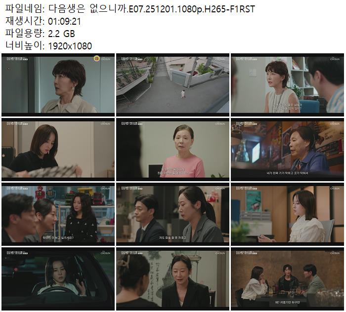 | 다음생은 없으니까.E07.251201.1080p.H265-F1RST.mp4 | 2.2 G | 01:09:00 | 1920x1080 |