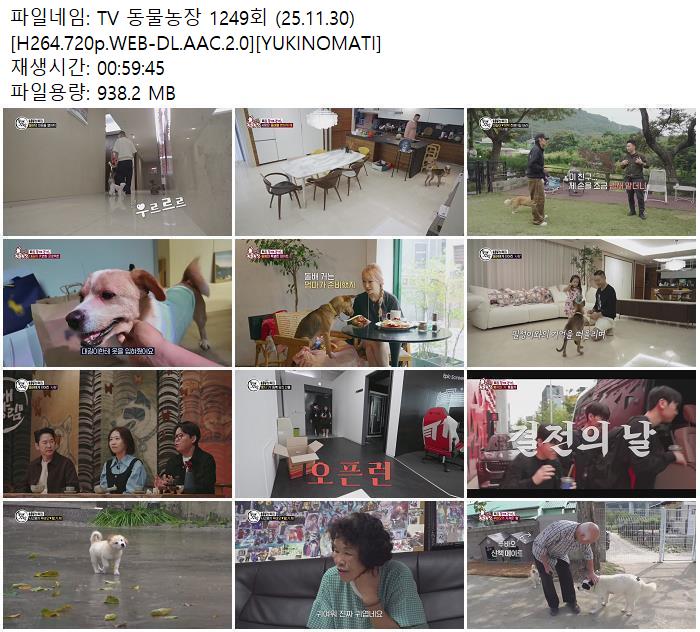 | TV 동물농장 1249회 (25.11.30) [H264.720p.WEB-DL.AAC.2.0][YUKINOMATI].mkv | 938.2 M | 00:59:45 | 1280x720 |