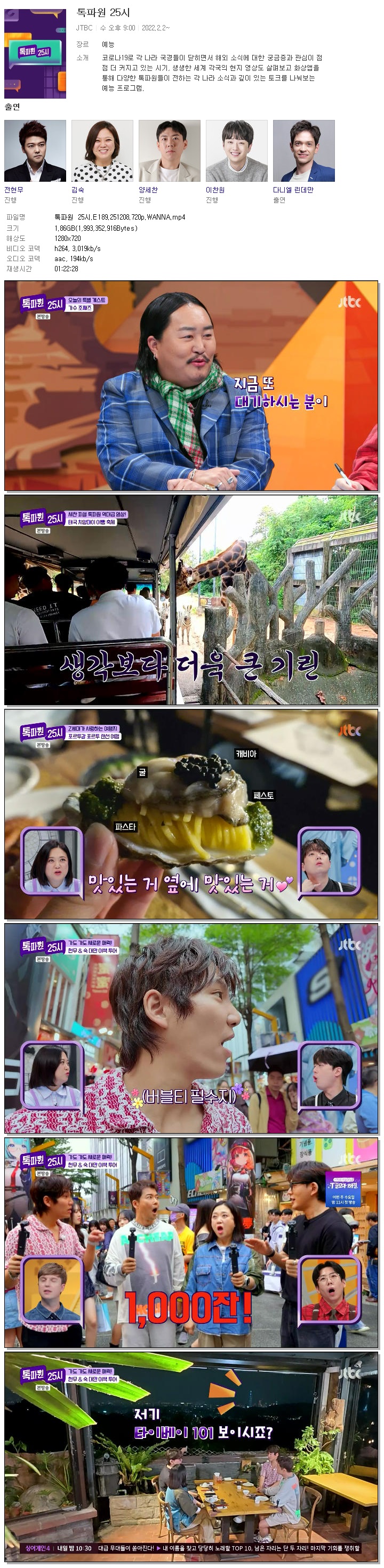 | [JTBC] 톡파원 25시.E189.251208.720p.WANNA[조째즈].mp4 | 1.9 G | 01:22:28 | 1280x720 |