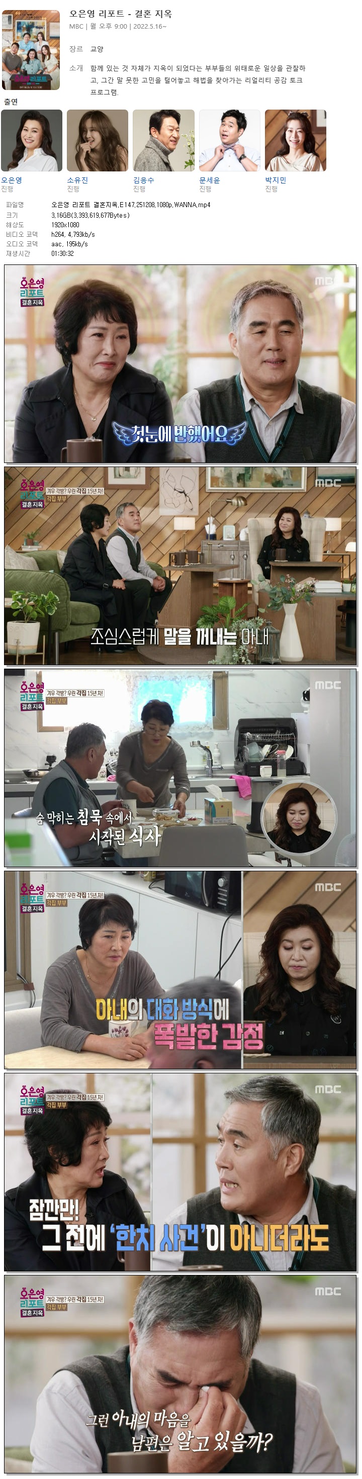 | [MBC] 오은영 리포트 결혼지옥.E147.251208.1080p.WANNA[오은영, 문세윤].mp4 | 3.2 G | 01:30:32 | 1920x1080 |