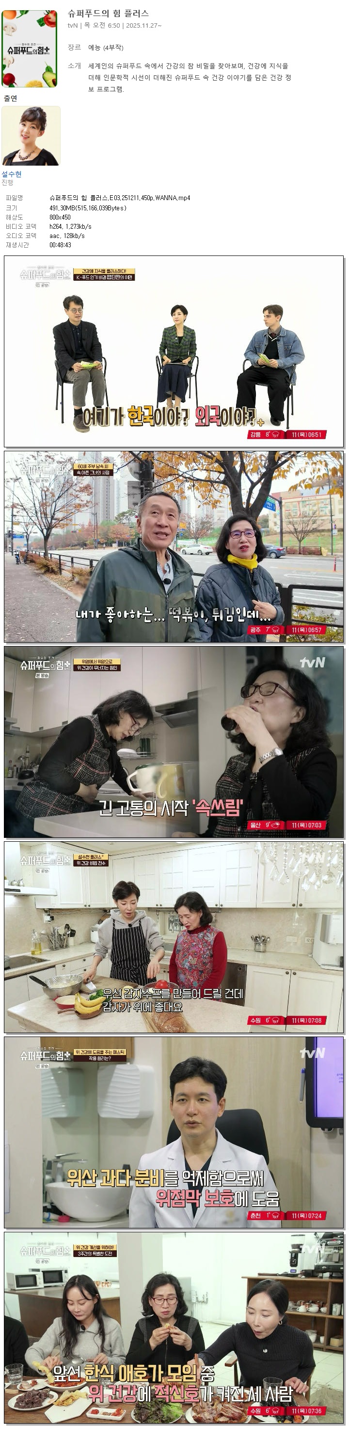 | [TVN] 슈퍼푸드의 힘 플러스.E03.251211.450p.WANNA[설수현].mp4 | 491.3 M | 00:48:43 | 800x450 |