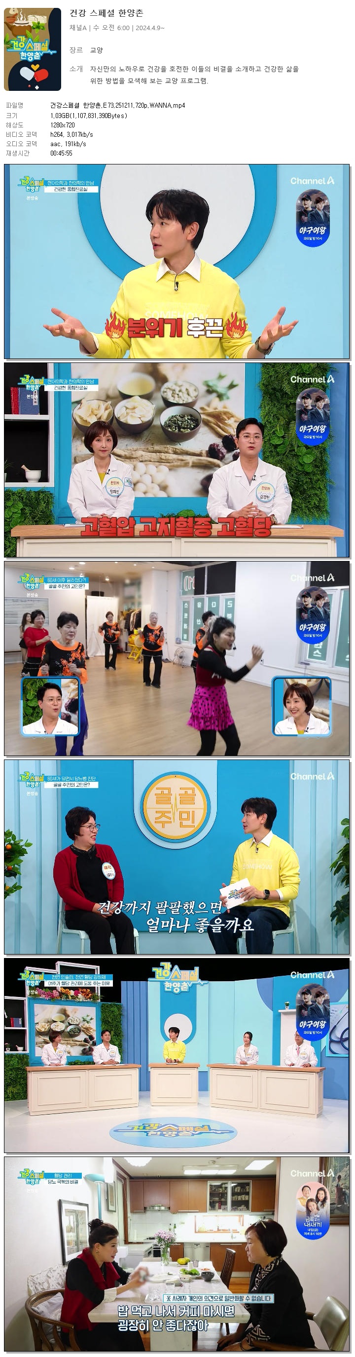 | [채널A] 건강스페셜 한양촌.E73.251211.720p.WANNA[김정근].mp4 | 1 G | 00:45:55 | 1280x720 |