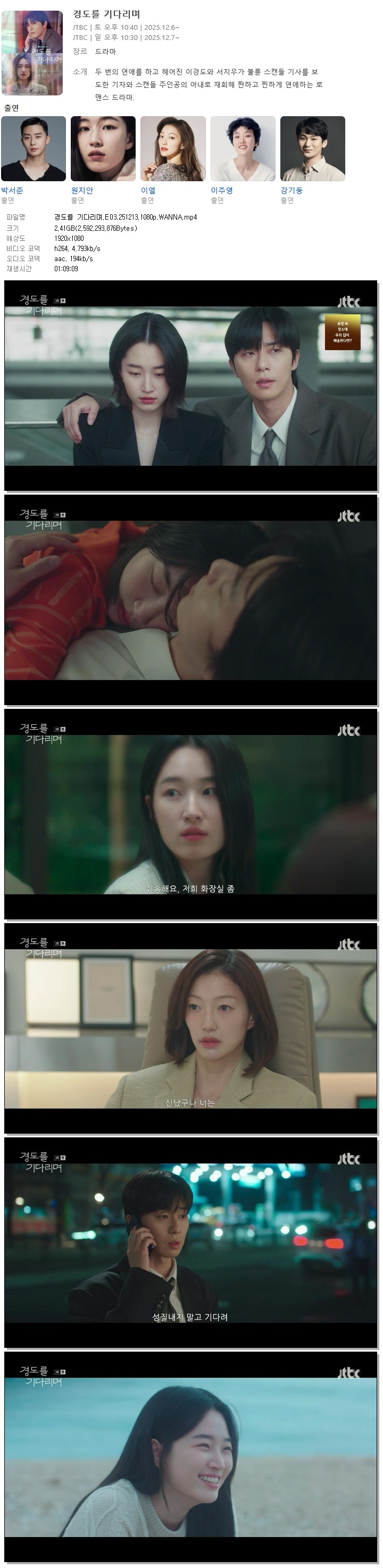 | [JTBC] 경도를 기다리며.E03.251213.1080p.WANNA[박서준, 원지안].mp4 | 2.4 G | 01:09:09 | 1920x1080 |