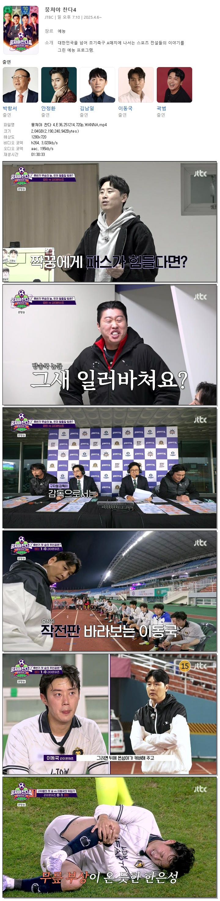 | [JTBC] 뭉쳐야 찬다 4.E36.251214.720p.WANNA[김남일, 안정환].mp4 | 2 G | 01:30:33 | 1280x720 |