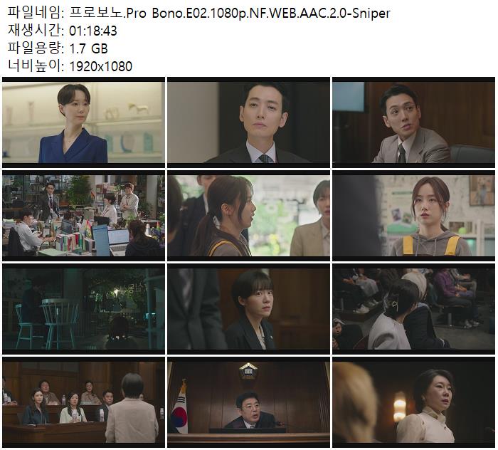 | 프로보노.Pro Bono.E02.1080p.NF.WEB.AAC.2.0-Sniper.mkv | 1.7 G | 01:18:00 | 1920x1080 |