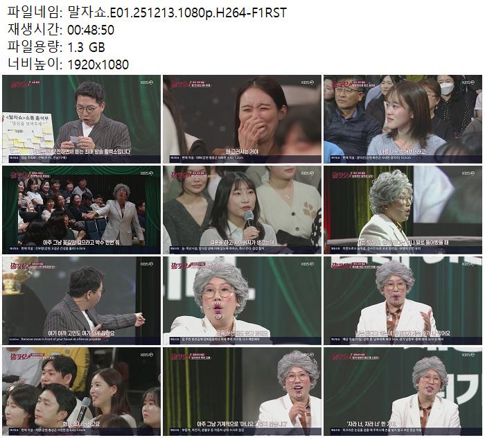 | 말자쇼.E01.251213.1080p.H264-F1RST.mp4 | 1.3 G | 00:48:50 | 1920x1080 |