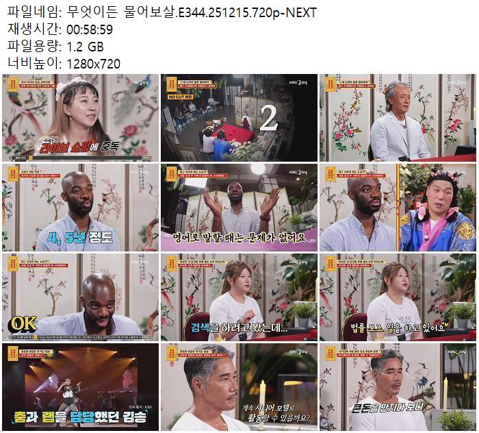 | 무엇이든 물어보살.E344.251215.720p-NEXT.mp4 | 1.2 G | 00:58:59 | 1280x720 |