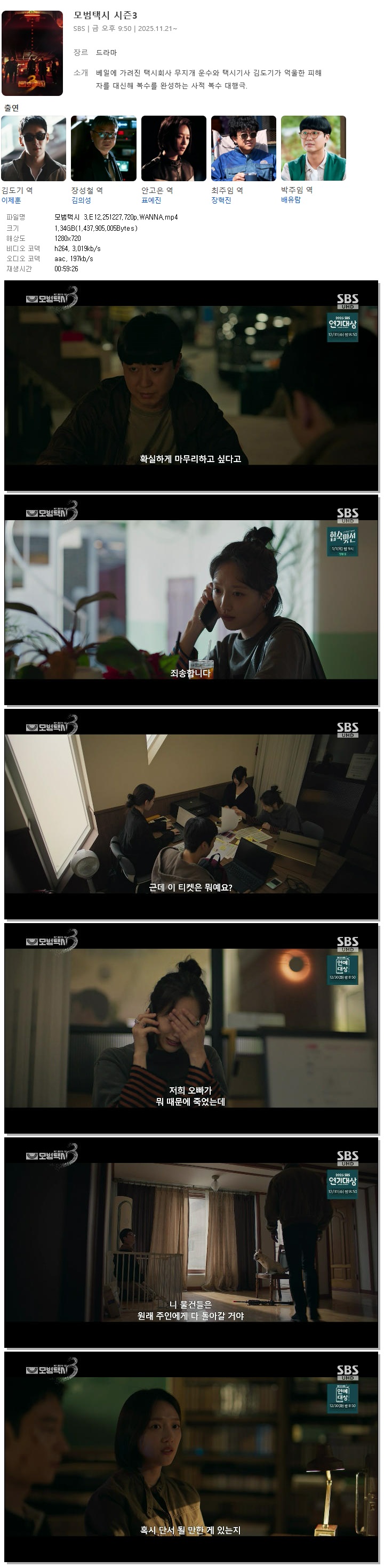 | [SBS] 모범택시 3.E12.251227.720p.WANNA[이제훈, 김의성].mp4 | 1.3 G | 00:59:26 | 1280x720 |