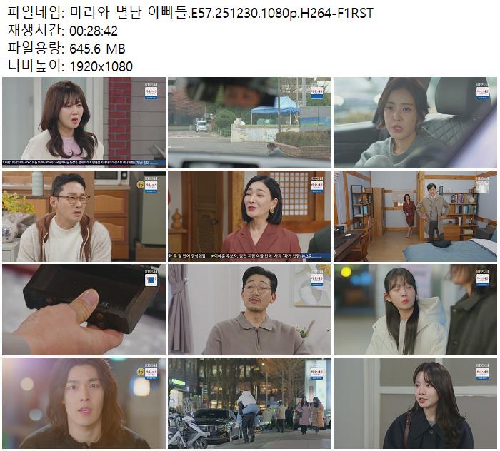 | 마리와 별난 아빠들.E57.251230.1080p.H264-F1RST.mp4 | 645.6 M | 00:28:42 | 1920x1080 |