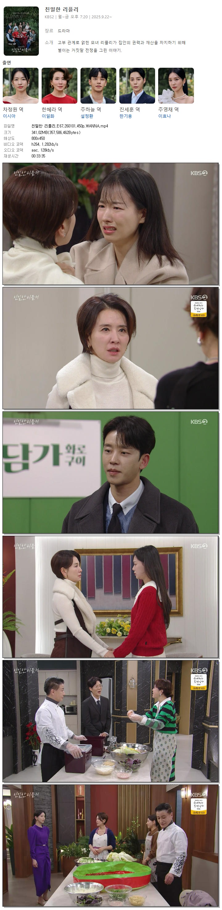 | [KBS2] 친밀한 리플리.E67.260101.450p.WANNA[이시아, 이일화].mp4 | 341 M | 00:33:35 | 800x450 |