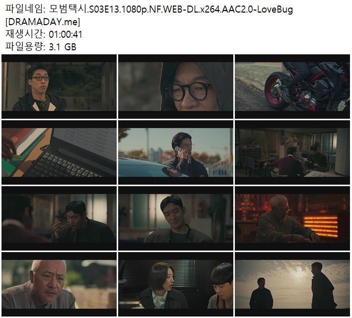 | 모범택시.S03E13.1080p.NF.WEB-DL.x264.AAC2.0-LoveBug [DRAMADAY.me].mkv | 3.1 G | 01:00:00 | 1920x1080 |