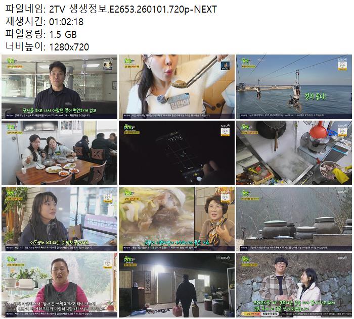 | 2TV 생생정보.E2653.260101.720p-NEXT.mp4 | 1.5 G | 01:02:00 | 1280x720 |