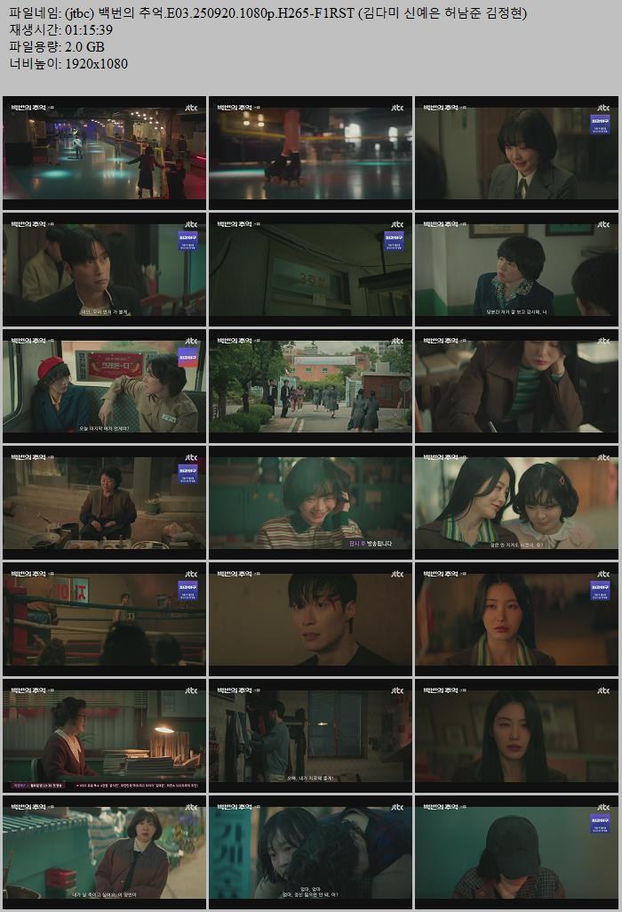 | (jtbc) 백번의 추억.E03.250920.1080p.H265-F1RST (김다미 신예은 허남준 김정현).mp4 | 2 G | 01:15:00 | 1920x1080 |