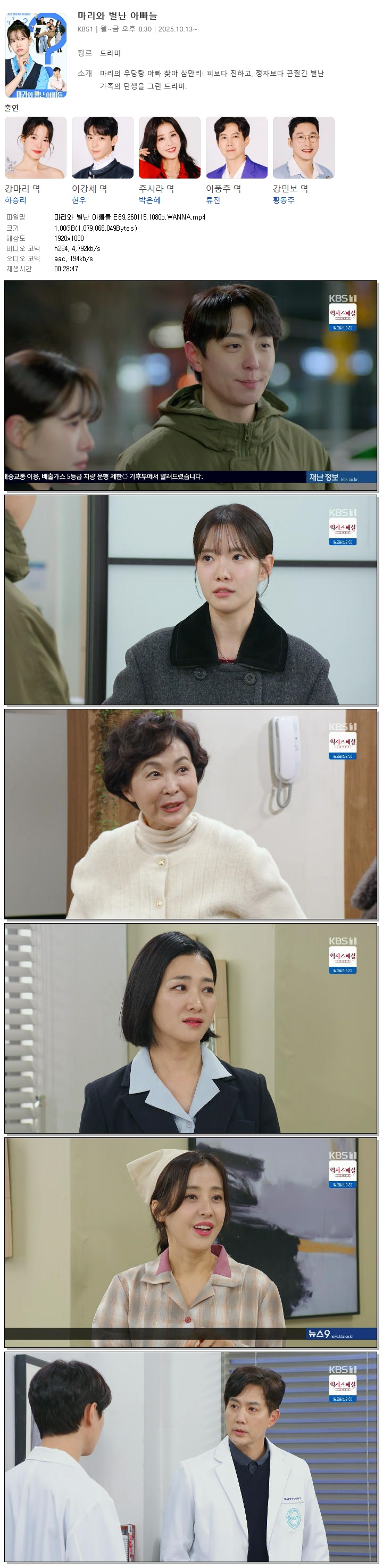 | [KBS1] 마리와 별난 아빠들.E69.260115.1080p.WANNA[하승리, 현우].mp4 | 1 G | 00:28:47 | 1920x1080 |