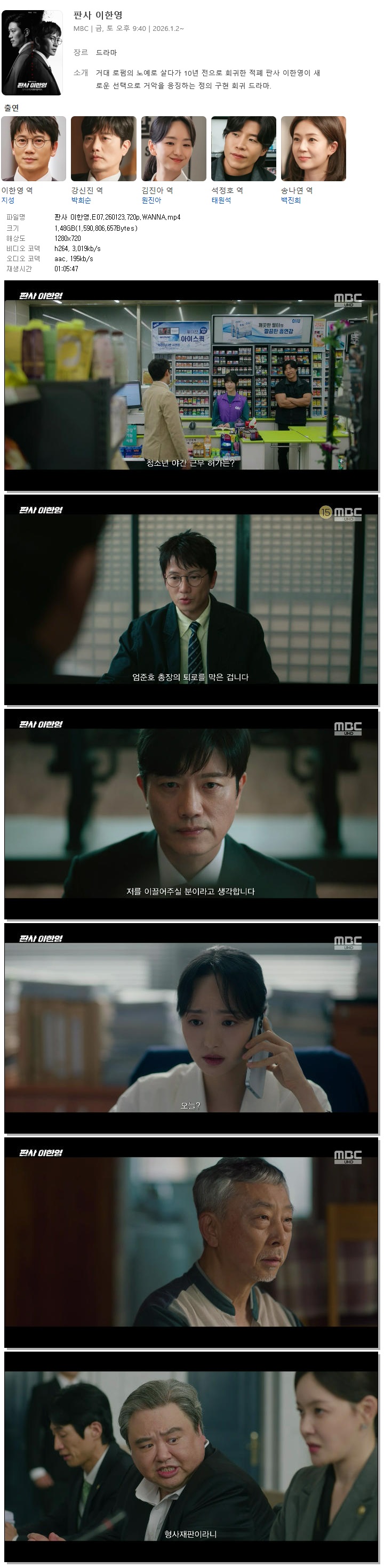 | [MBC] 판사 이한영.E07.260123.720p.WANNA[지성, 원진아].mp4 | 1.5 G | 01:05:47 | 1280x720 |