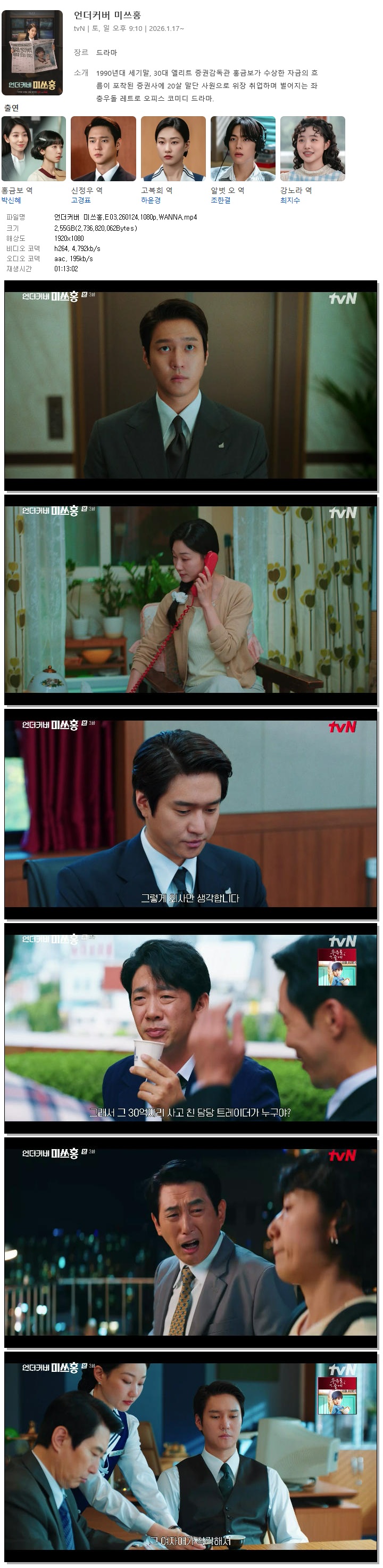 | [TVN] 언더커버 미쓰홍.E03.260124.1080p.WANNA[박신혜, 고경표].mp4 | 2.5 G | 01:13:02 | 1920x1080 |