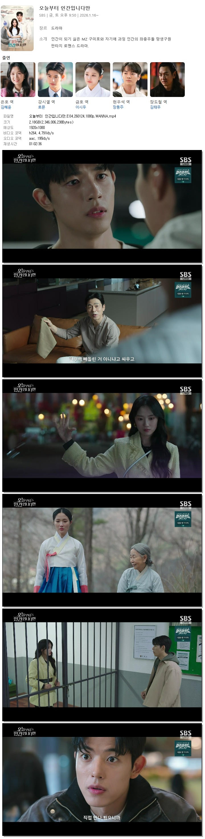 [SBS] 오늘부터 인간입니다만.E04.260124.1080p.WANNA[김혜윤, 로몬].mp4 2.2 G 01:02:36 1920x1080