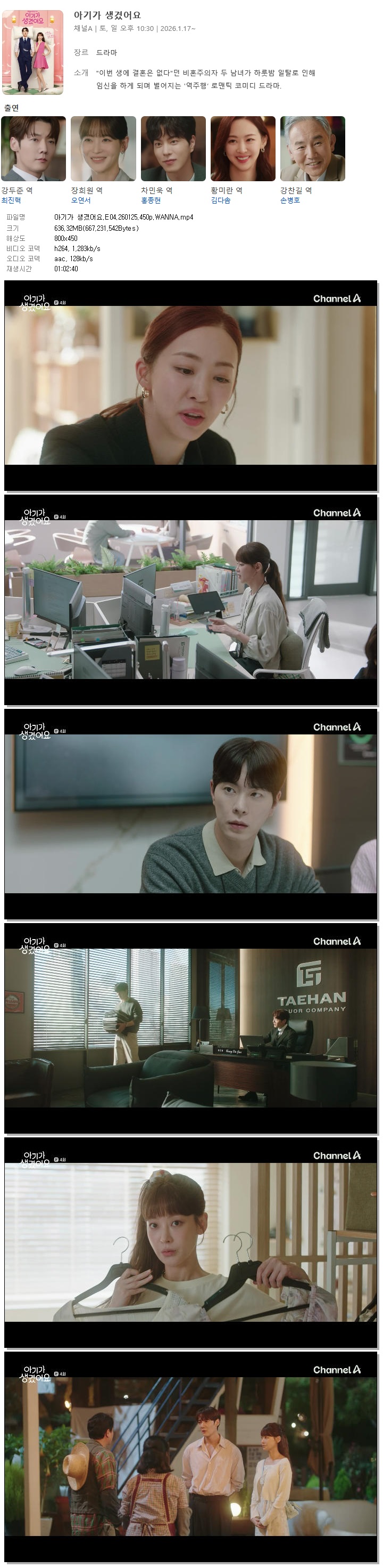 | [채널A] 아기가 생겼어요.E04.260125.450p.WANNA[최진혁, 오연서].mp4 | 636.3 M | 01:02:40 | 800x450 |