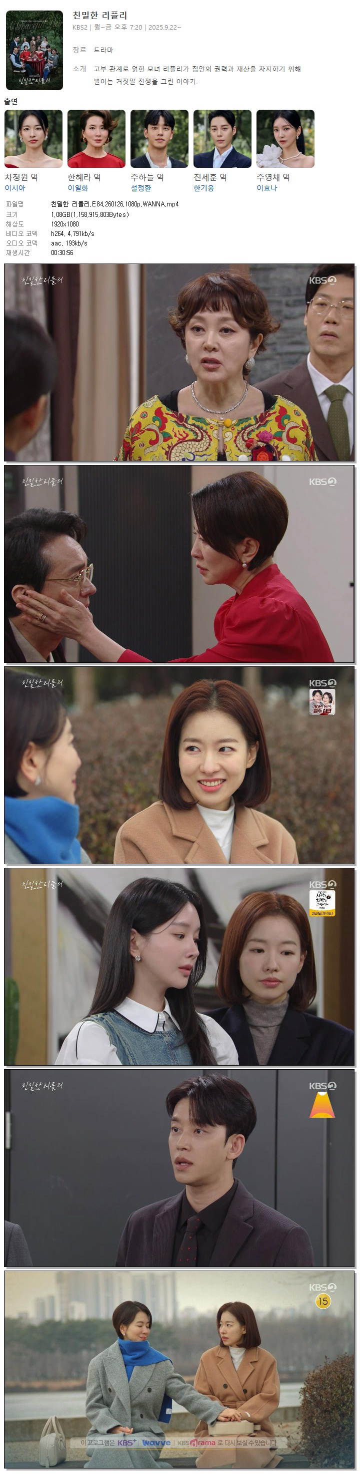 | [KBS2] 친밀한 리플리.E84.260126.1080p.WANNA[이시아, 이일화].mp4 | 1.1 G | 00:30:56 | 1920x1080 |