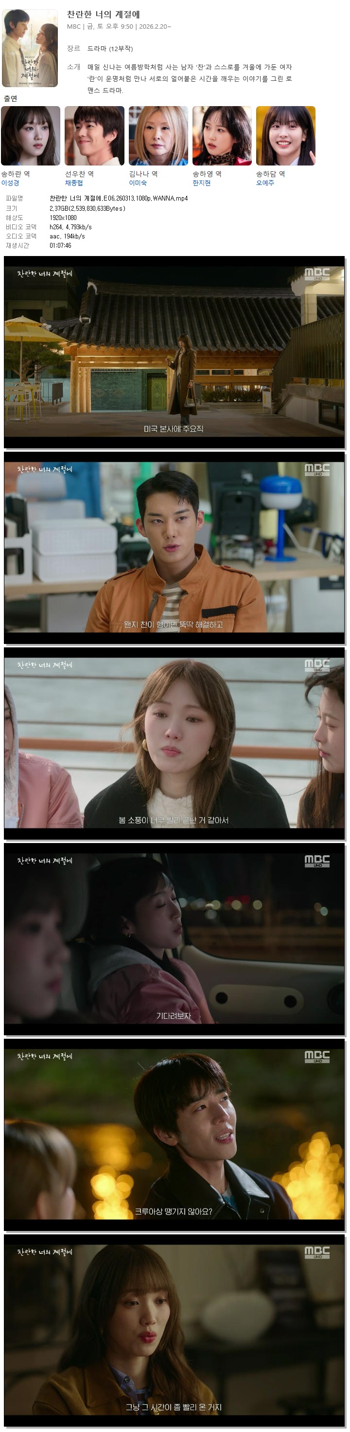 | [MBC] 찬란한 너의 계절에.E06.260313.1080p.WANNA[이성경, 채종협].mp4 | 2.4 G | 01:07:46 | 1920x1080 |