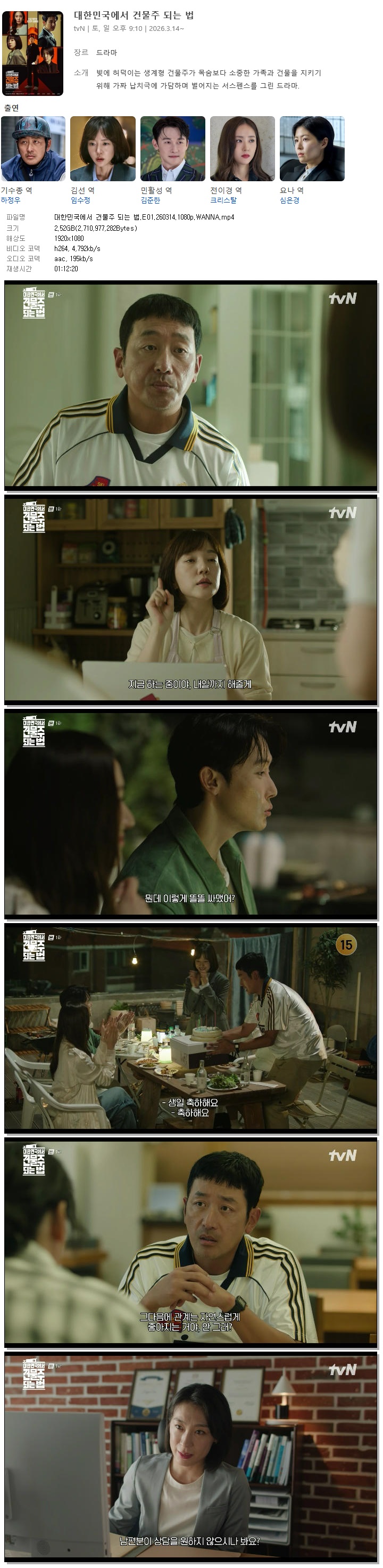 | [TVN] 대한민국에서 건물주 되는 법.E01.260314.1080p.WANNA[하정우, 임수정].mp4 | 2.5 G | 01:12:20 | 1920x1080 |