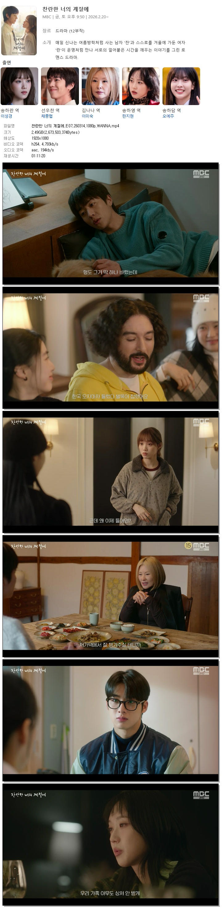 | [MBC] 찬란한 너의 계절에.E07.260314.1080p.WANNA[이성경, 채종협].mp4 | 2.5 G | 01:11:20 | 1920x1080 |
